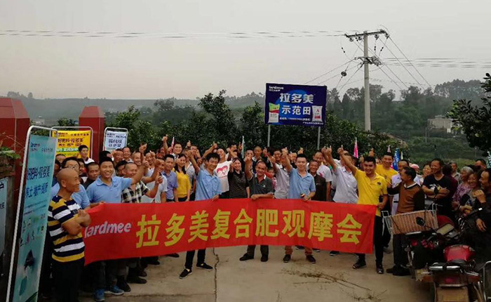 - 2017年9月25日,眉山丹棱中隆鄉天宮村,廣東拉多美化肥組織了130多人,觀摩了解了示范戶家的柑橘,在同樣的管理下,使用了拉多美化肥的柑橘樹樹勢更好葉片更綠更厚,觀摩農戶都贊不絕口。并由拉多美技術人員現場講解了柑橘科學種植管理技術,及病蟲害、缺素癥的識別管理。