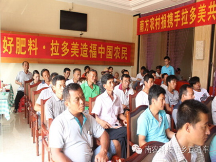 9月19日,拉多美“南方農(nóng)村報(bào)科技下鄉(xiāng)直通車”繼續(xù)在海南刮起科技下鄉(xiāng)風(fēng),來到了芒果、木瓜、香蕉的種植圣地---樂東縣黃流鎮(zhèn)金雞嶺。這是本月在海南舉辦的第五場(chǎng)活動(dòng),也是廣東拉多美化肥有限公司專場(chǎng)的第三站。 廣東拉多美化肥有限公司客戶經(jīng)理王吉為大家?guī)砹素S富的禮品,大耕戶農(nóng)資貿(mào)易有限公司提供現(xiàn)場(chǎng)訂貨優(yōu)惠政策,現(xiàn)場(chǎng)訂貨接近三百噸,其中金雞嶺新建基地朱老板現(xiàn)場(chǎng)一口氣訂150噸拉多美純硝基,引爆全場(chǎng)。 作為主辦方之一的廣東拉多美化肥有限公司,一直以來秉承了專心做好肥,造福中國(guó)農(nóng)民的企業(yè)理念,為廣大種植戶提供優(yōu)質(zhì)高效的肥料產(chǎn)品,不斷推出優(yōu)惠促銷活動(dòng)惠及廣大農(nóng)戶,并一如既往地支持社會(huì)公益活動(dòng),與南方農(nóng)村報(bào)合力打造科技下鄉(xiāng)活動(dòng)品牌,將科技到戶、服務(wù)到家進(jìn)行到底。